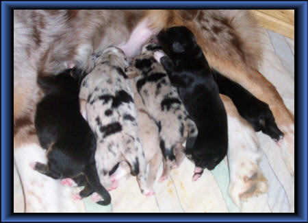 Am 3. Mai sind 8 Welpen von Sue und Floyd zur Welt gekommen. Su hat es prima gemacht! Es sind 7 Söhne und eine blue-merle Princessin. 4 Jungs, black-tri, ganz der Papa 2 Blue-merles 1 red-merle Allen geht es prima. |